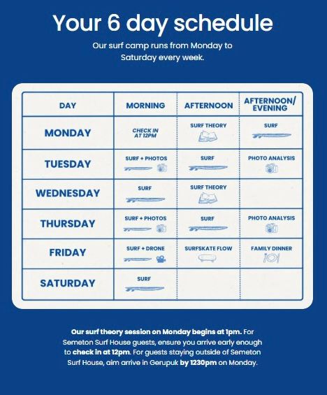 Every day, you’ll be picked up from your stay and taken to Semeton Surf House for professional surf coaching, surf theory lessons, and two-way surf sessions with local experts who know the breaks inside out. No accommodation or breakfast included — only the pure surfing experience.